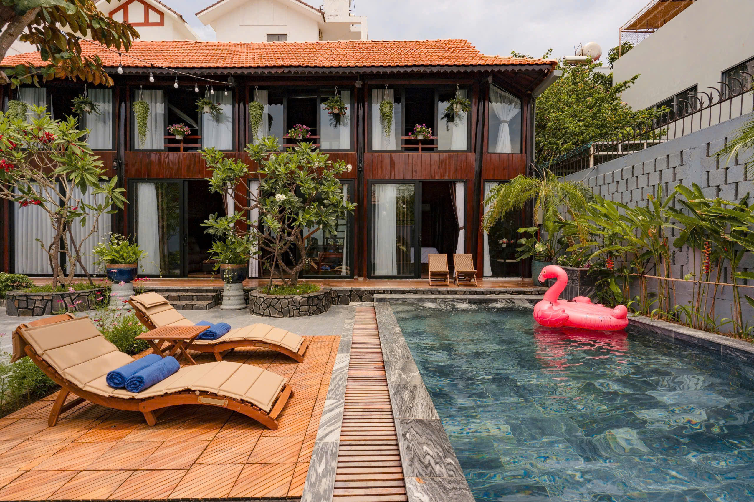 Villa Long Cung cao cấp, hồ tràn 56m2, sân vườn lớn, karaoke, bida, không gian nghỉ dưỡng riêng tư.